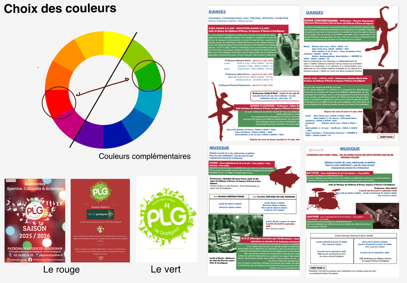 Au début j’ai voulu faire uniquement tous les visuels en rouge car cela reprenait la couverture originale. Puis j’ai rajouté du vert, car le vert est complémentaire au rouge mais c’est aussi la couleur utilisée sur le logo du PLG.